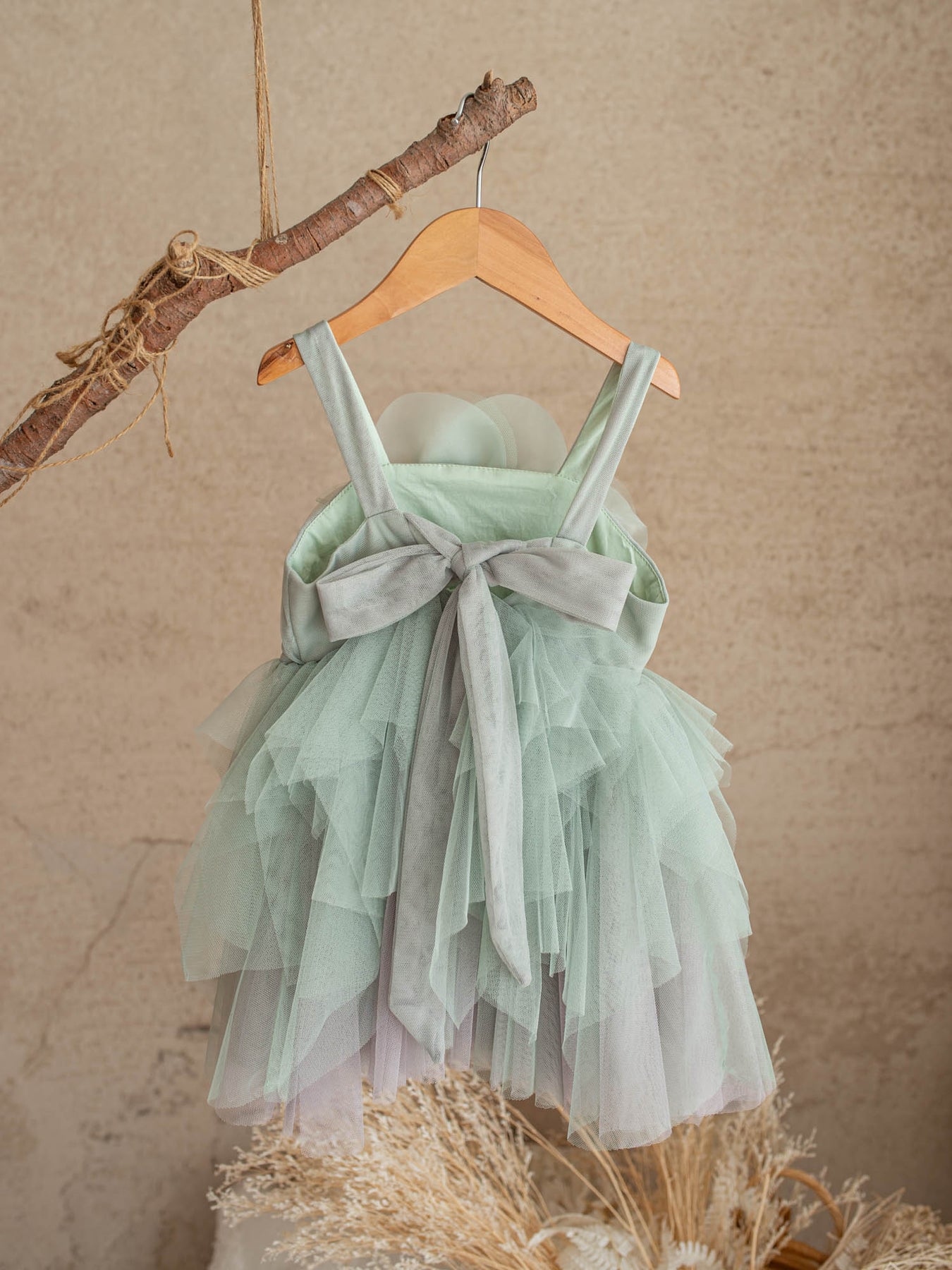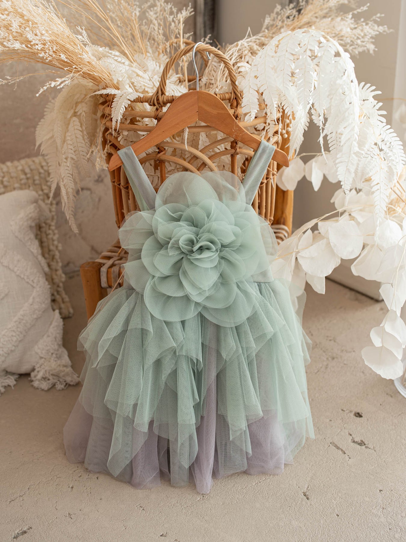 "She's The One" Dress, where fairy tale dreams swirl into reality. This captivating flower girl dress features multi-toned layers of soft bridal tulle, beautifully blended with our handcrafted oversized flower centerpiece, turning every glance into a second look.