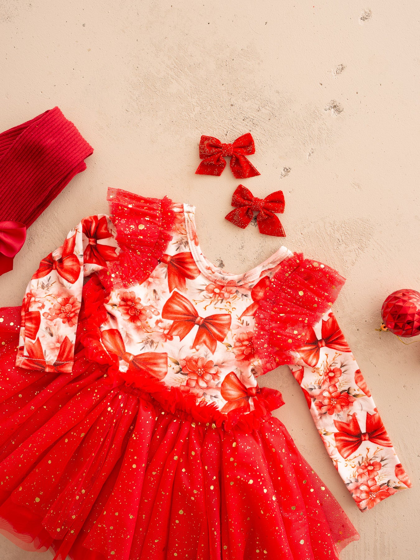 Festive Showstopper – A magical Christmas dress featuring our signature red bow print and layers of glittering tulle for the ultimate holiday sparkle.