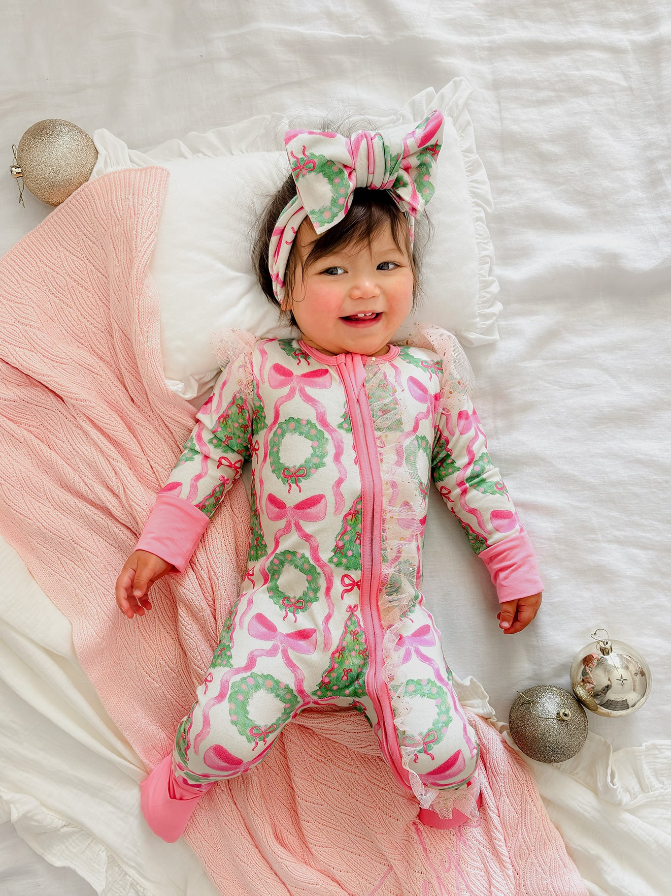 Deck the halls (and your cutie). A lively pink-and-green holiday wreath print and glitter tulle ruffles make this girls’ Christmas zipper romper pure joy.