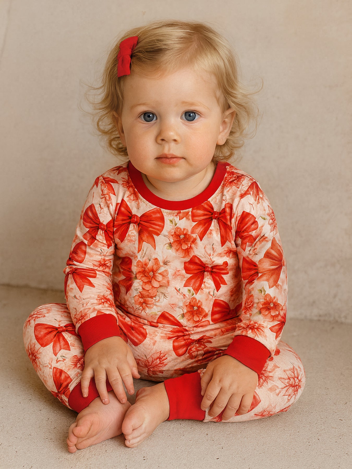 Wrap your little one in the magic of Christmas with our All I Wish Red Bow PJ Set — a festive essential designed for cozy nights, joyful mornings, and picture-perfect family moments. Crafted from an ultra-soft bamboo-cotton blend, these PJs are breathable, gentle on sensitive skin, and stretchy for all-night comfort. Featuring our signature red bow print that matches perfectly with our All I Wish Red Bow Onesie and All I Wish Red Bow Dress, this set makes sibling or family matching absolutely irresistible. Whether it’s Christmas Eve cuddles, morning gift unwrapping, or a festive photo shoot, this is the ultimate holiday PJ for magical memories.