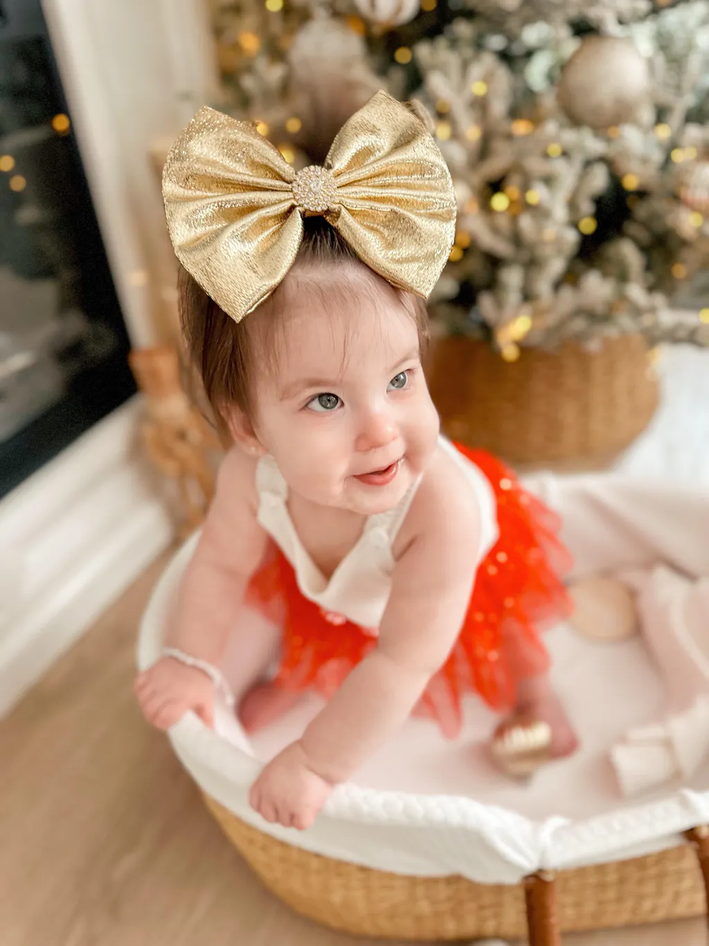 Festive & Fun: Red glitter tulle tutu skirt layered over soft knit romper for the ultimate Christmas sparkle.