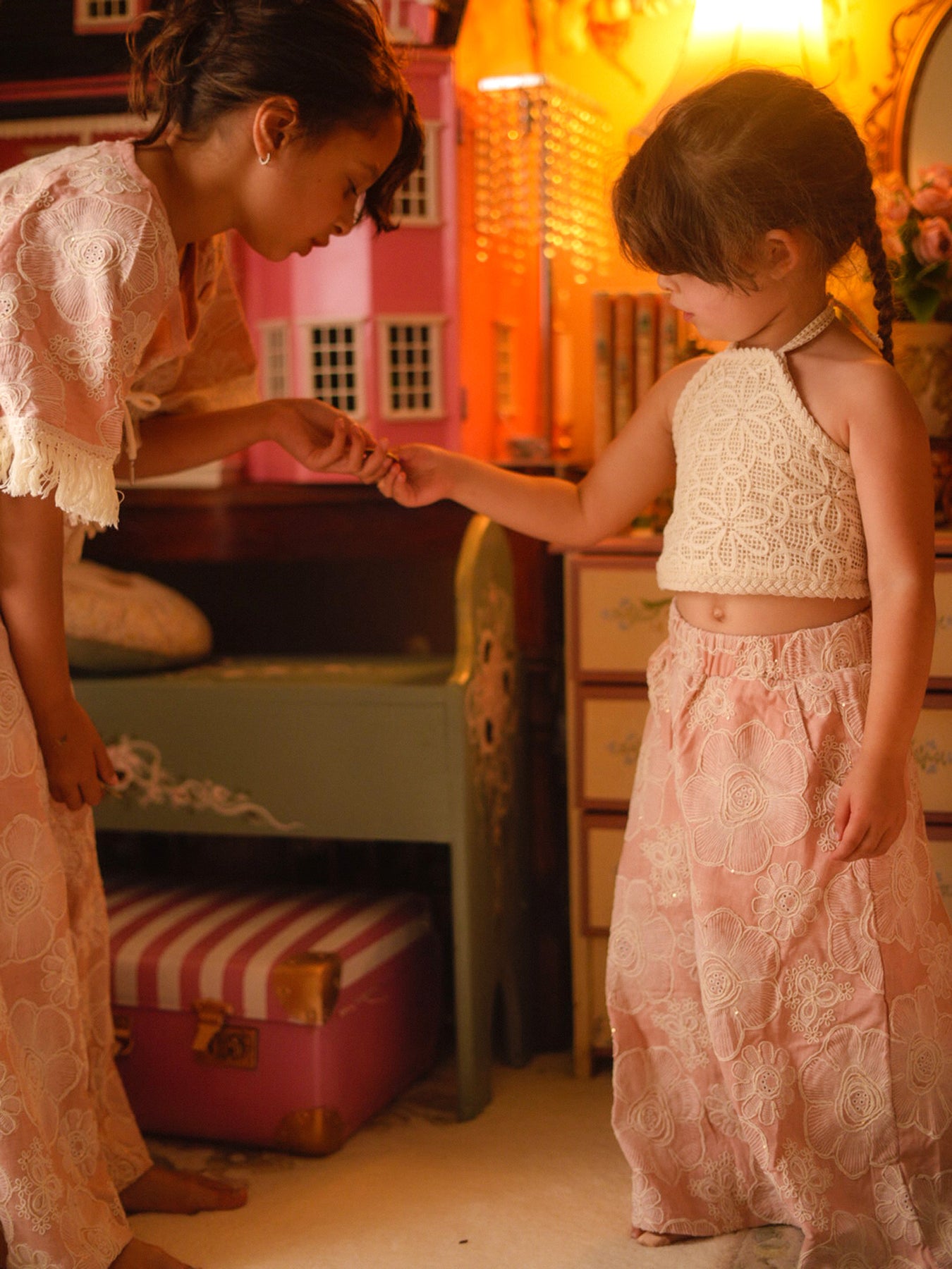 A pair of pants that feel like a fairytale. The Lace Story Wide-Leg Pants feature our full custom-embroidered floral fabric — soft, breathable, and full of boho-princess charm.or lazy days at home, these pink toddler sweatpants are a wardrobe essential for every season.