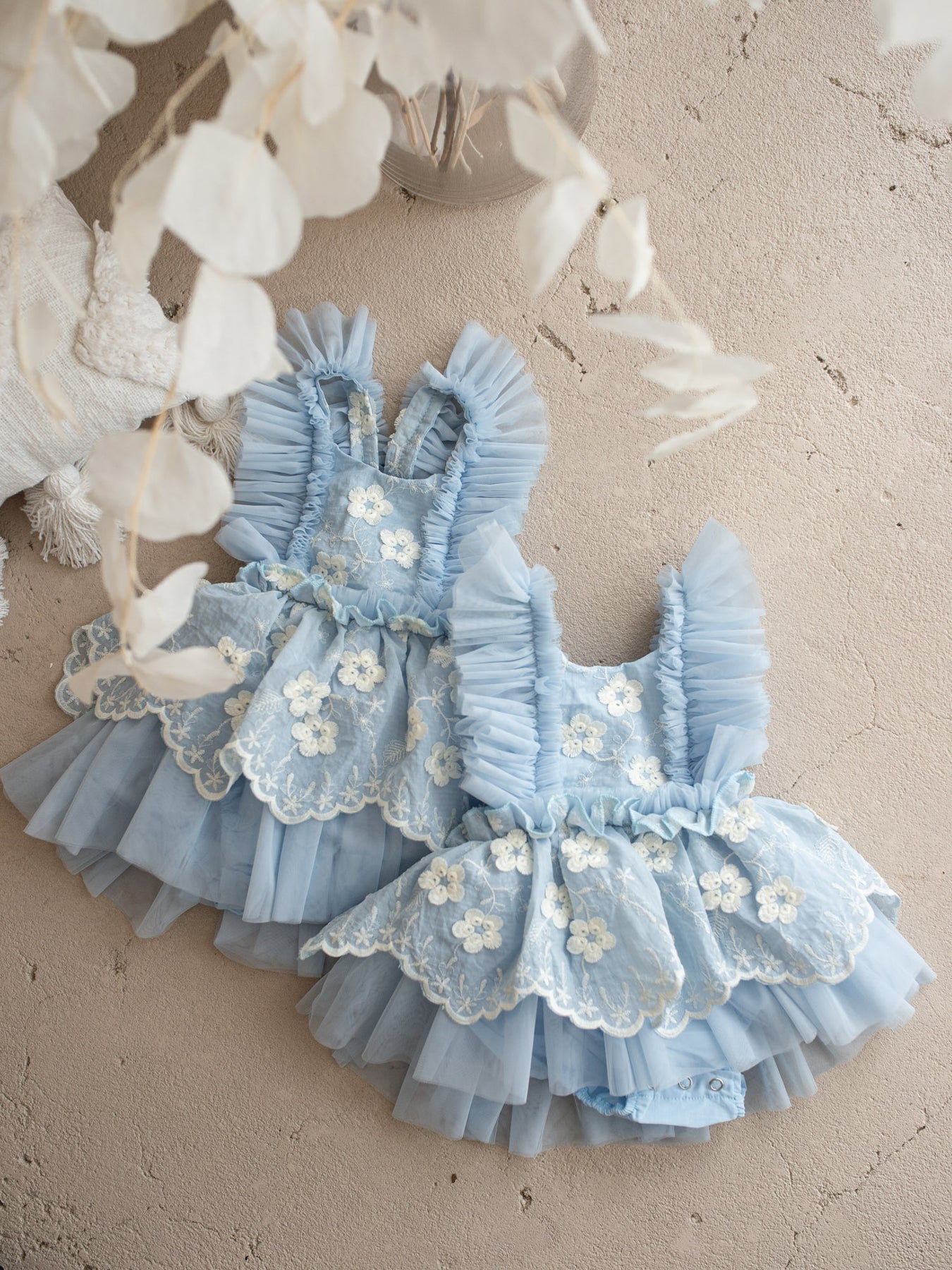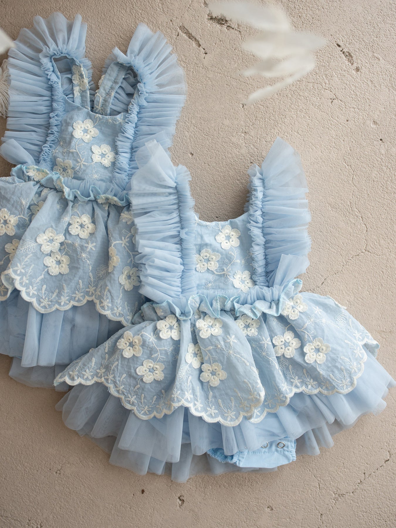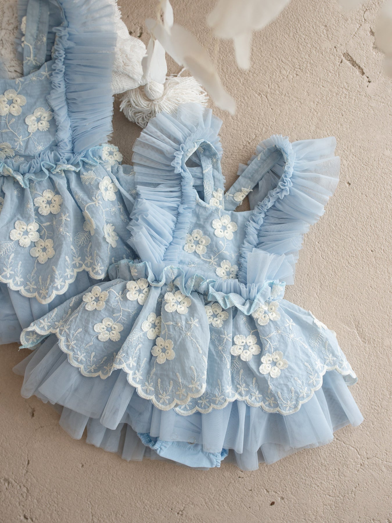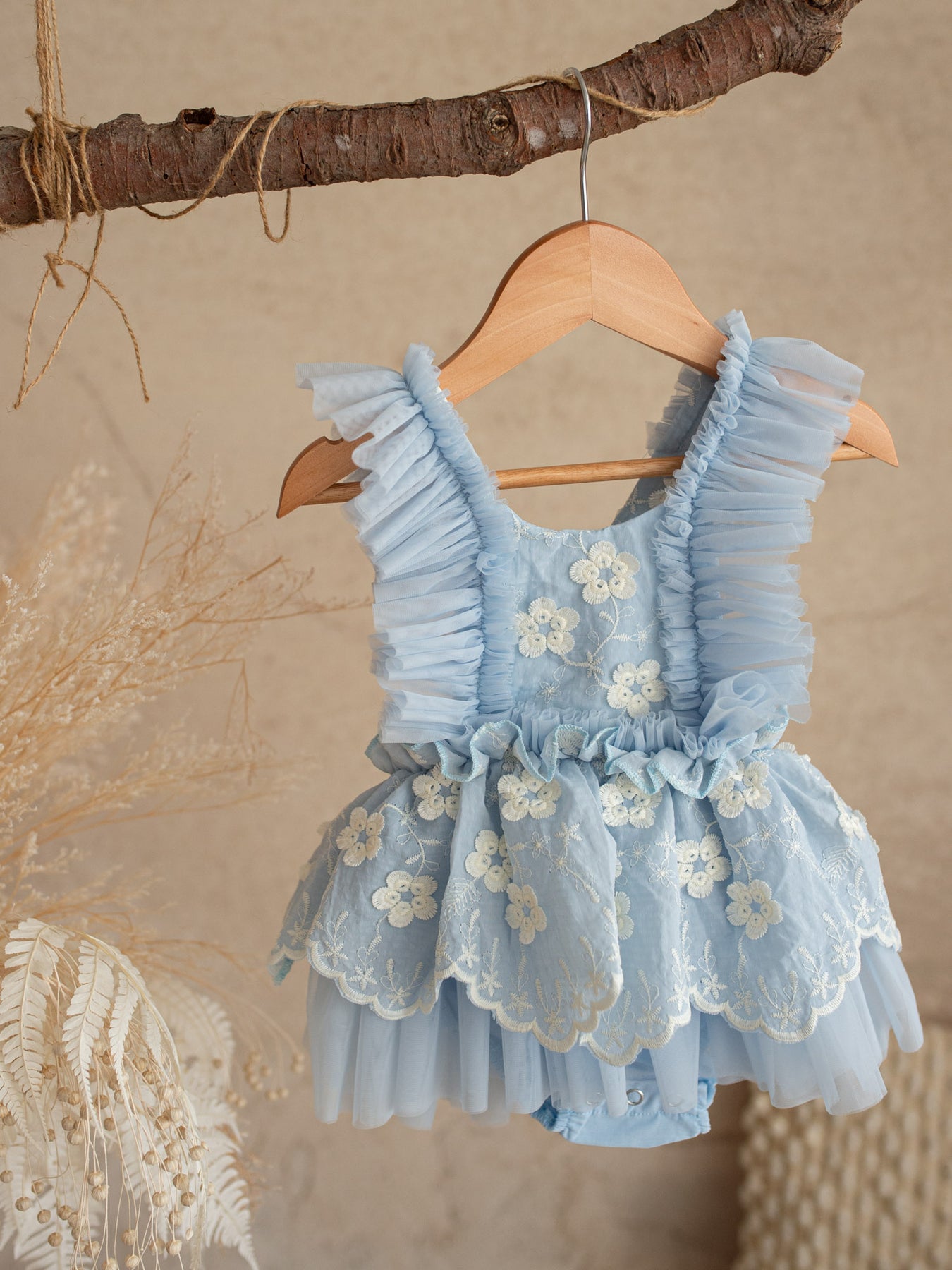 Crafted with layers of ultra-soft tulle and fully lined in 100% breathable cotton, this delicate piece features dainty embroidered florals scattered across a cloud-like skirt and romantic ruffled straps that frame the shoulders beautifully. The adjustable back allows for a comfortable, flexible fit as your little one grows, making it perfect for special days and everyday magic alike. Designed in the softest pastel tones, it’s a piece made for twirls, cuddles, milestones, and everything in between.