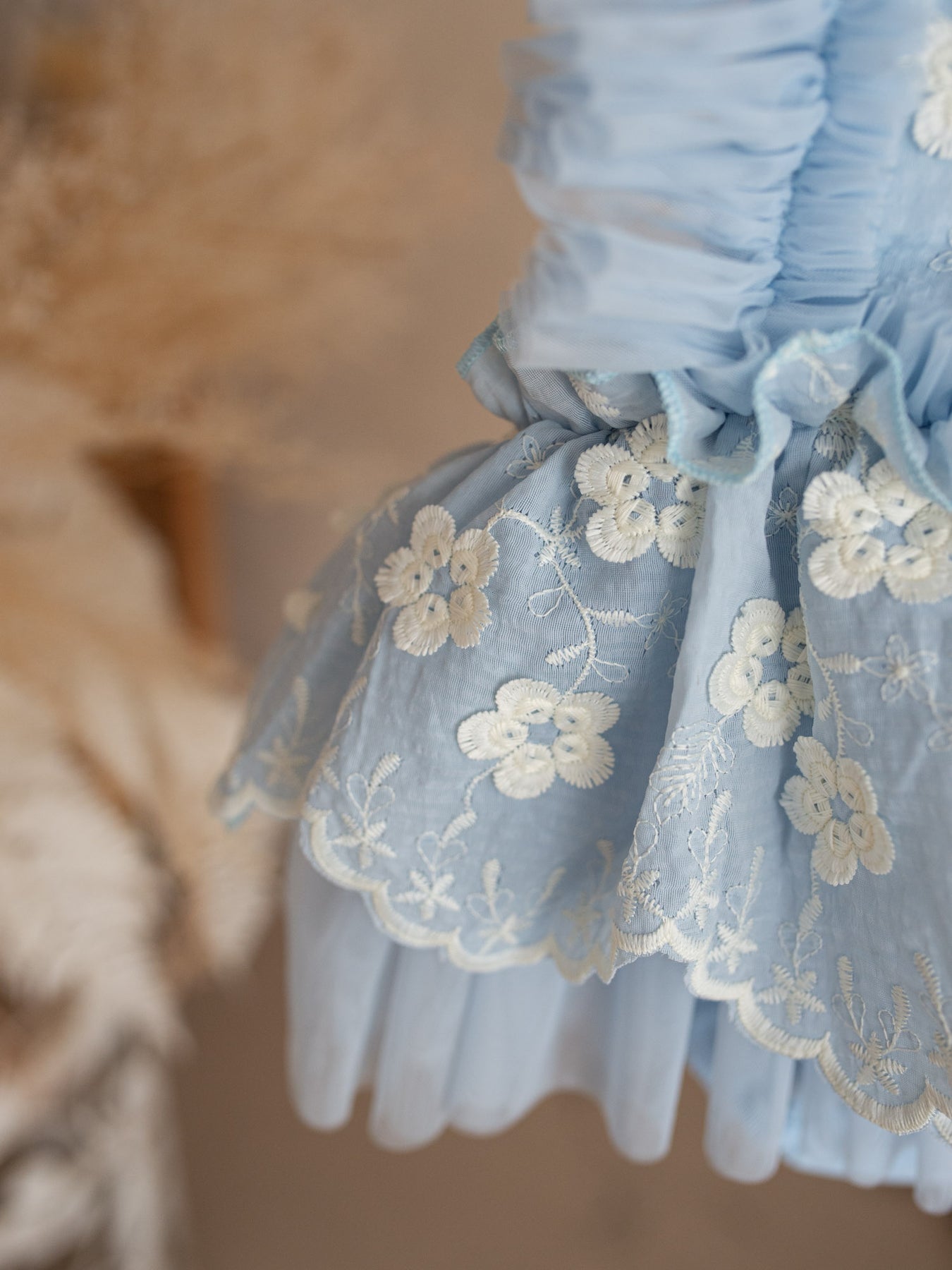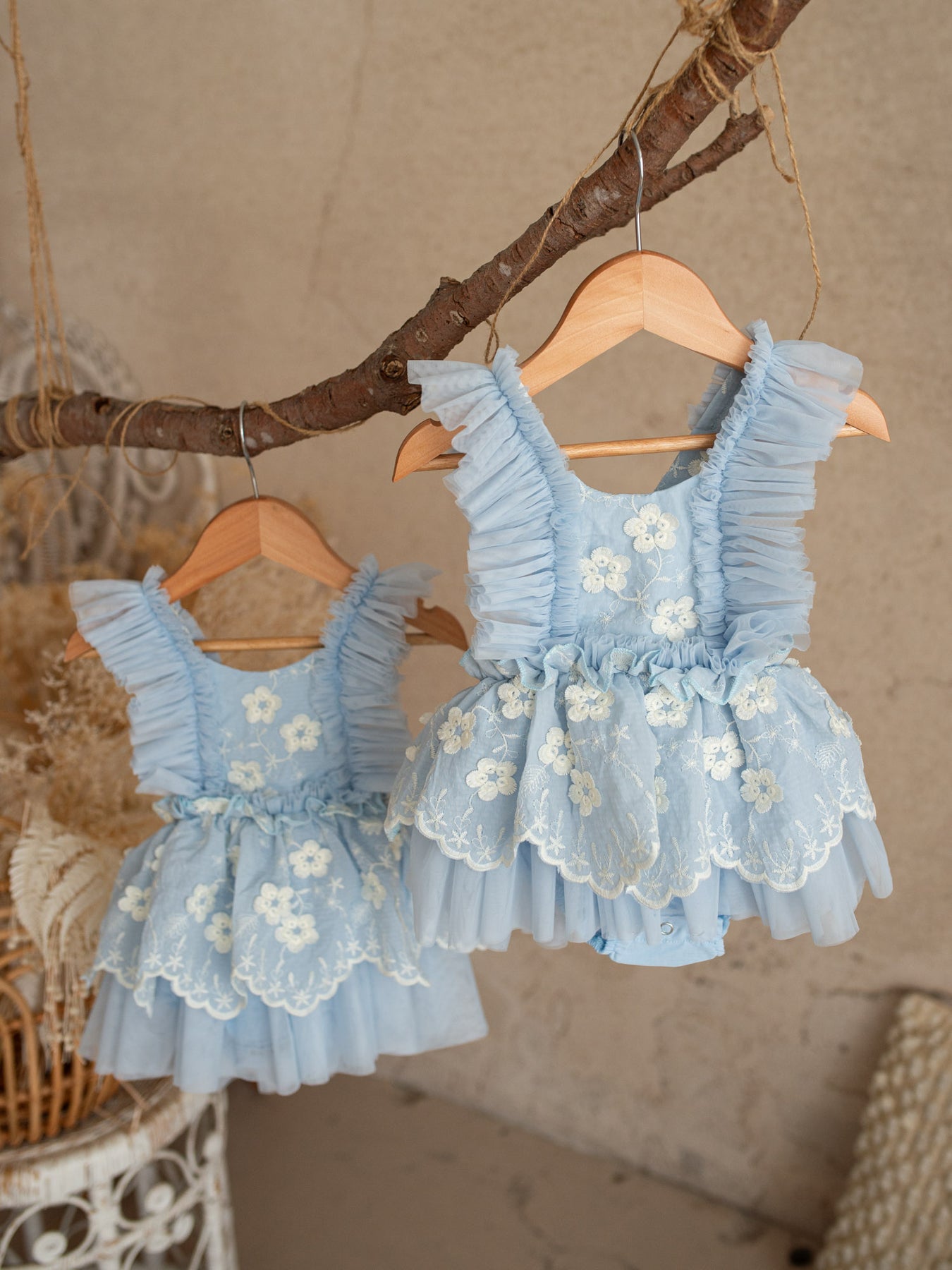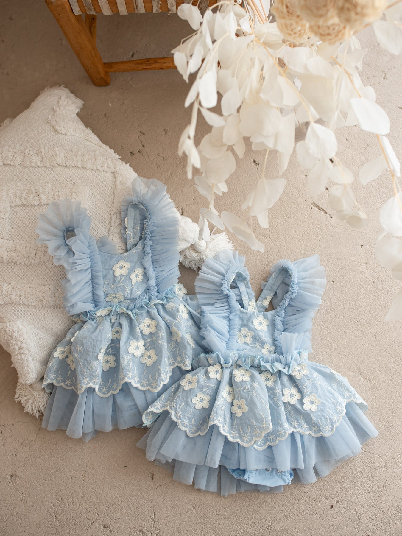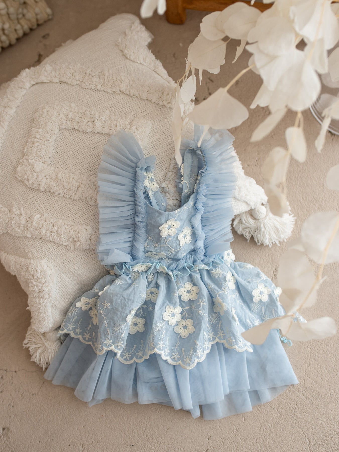 Crafted with layers of ultra-soft tulle and fully lined in 100% breathable cotton, this delicate piece features dainty embroidered florals scattered across a cloud-like skirt and romantic ruffled straps that frame the shoulders beautifully. The adjustable back allows for a comfortable, flexible fit as your little one grows, making it perfect for special days and everyday magic alike. Designed in the softest pastel tones, it’s a piece made for twirls, cuddles, milestones, and everything in between.