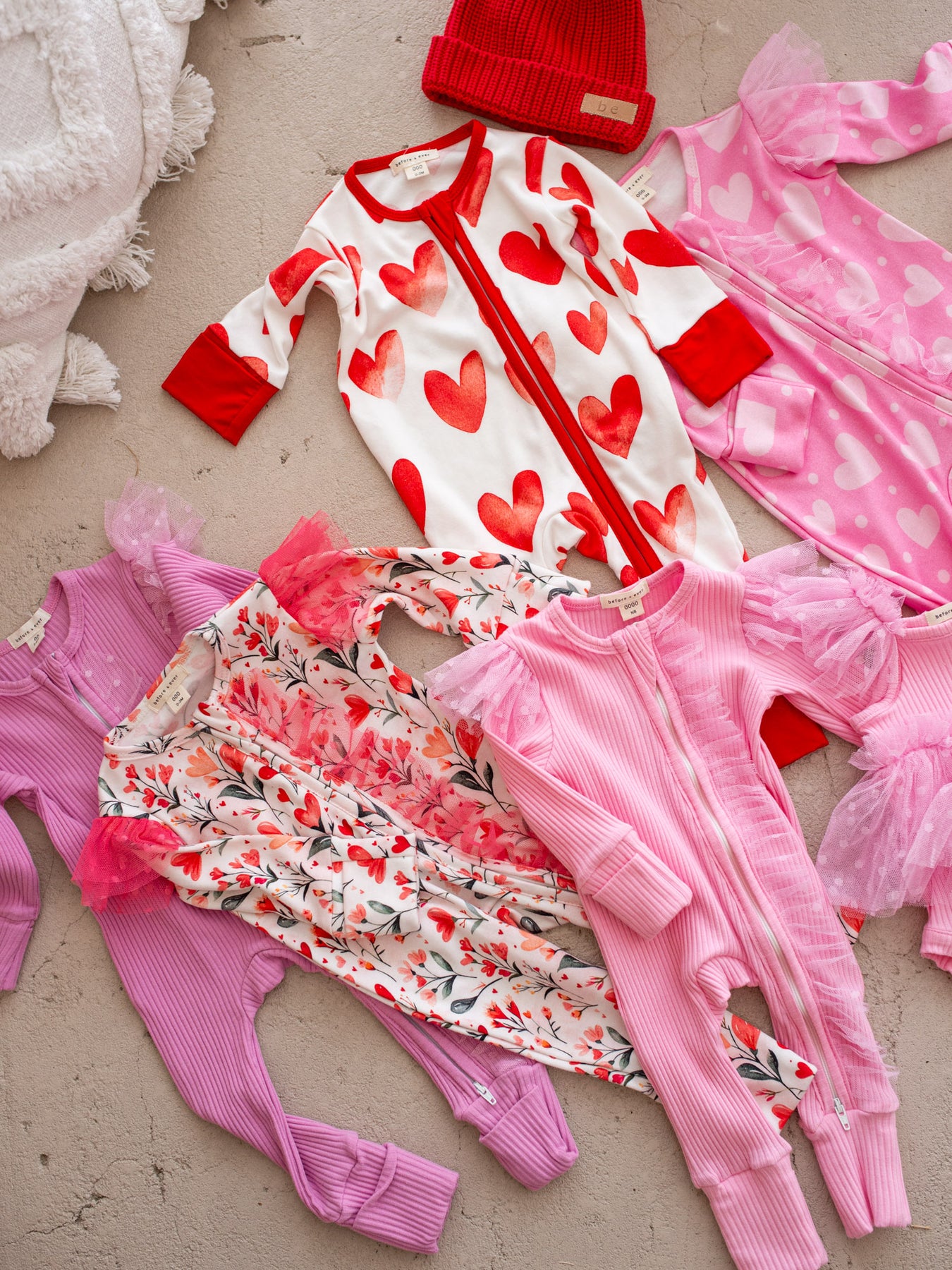 Floral Hearts + Ruffles: Sweet floral and heart print with tulle ruffles.