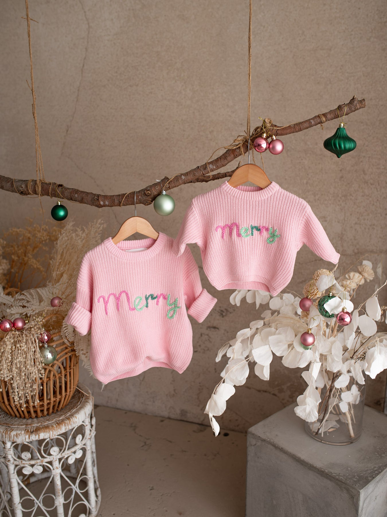 Hand Embroidered Detail: “Merry” stitched in festive pastel yarn for a playful finish.