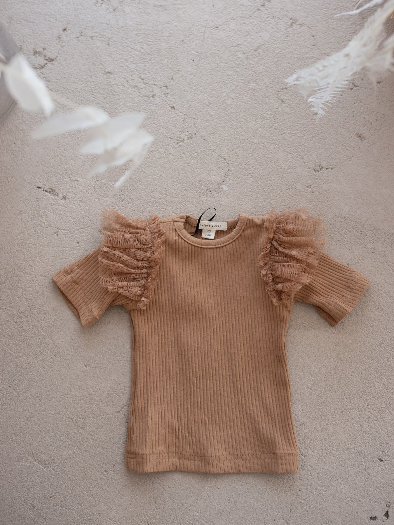 Made to match, built to love forever. This ribbed tee in our signature dark sage tone brings softness, stretch, and sweet little frills to everyday dressing. With delicate tulle ruffle sleeves and a flattering slim fit, it's the perfect base layer under our Flower Story Hoodie or paired with the matching tutu skirt leggings for the ultimate girl gang look. Cozy yet breathable, this top is an essential piece in every little wardrobe—ready for twirls, tea parties, and everything in between.