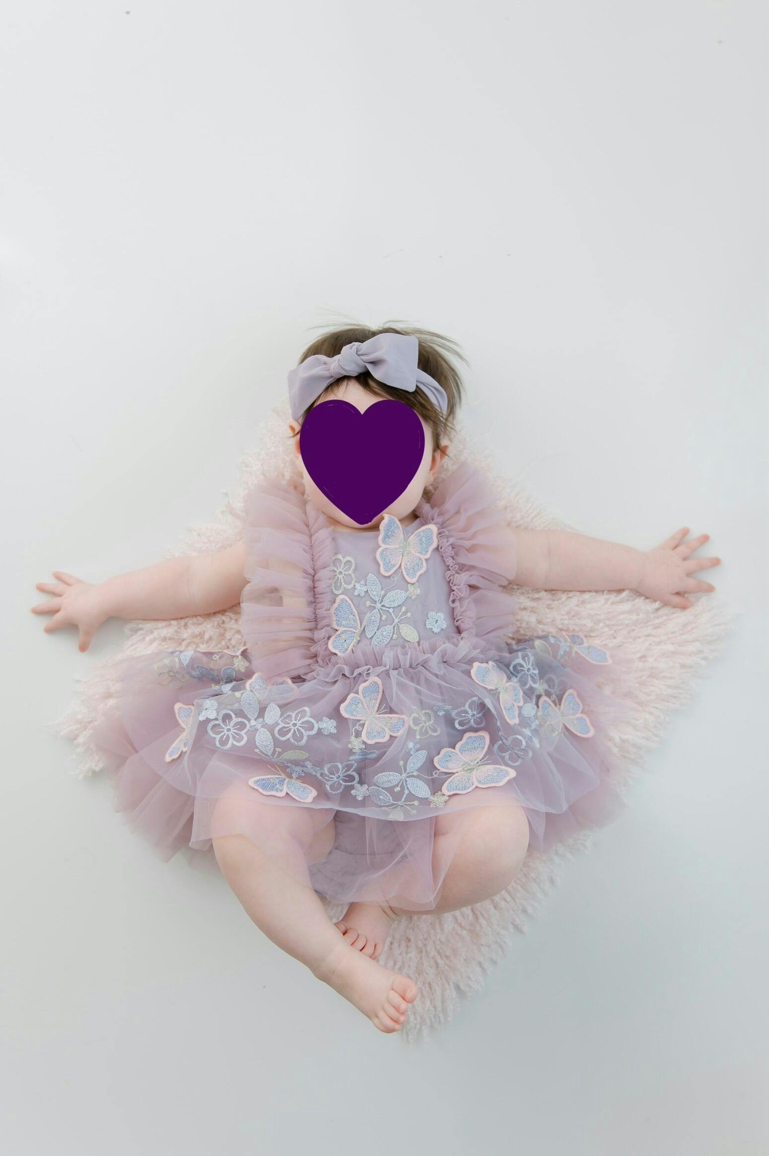 Embrace the ballet of flutter with the "She's A Butterfly" enchanted tulle dress, the perfect companion to our beloved romper for the big sister with dreams as high as the sky. This dress is a cascade of whimsy and grace, crafted in the softest hues of lavender, where butterflies dance and dreams take flight.